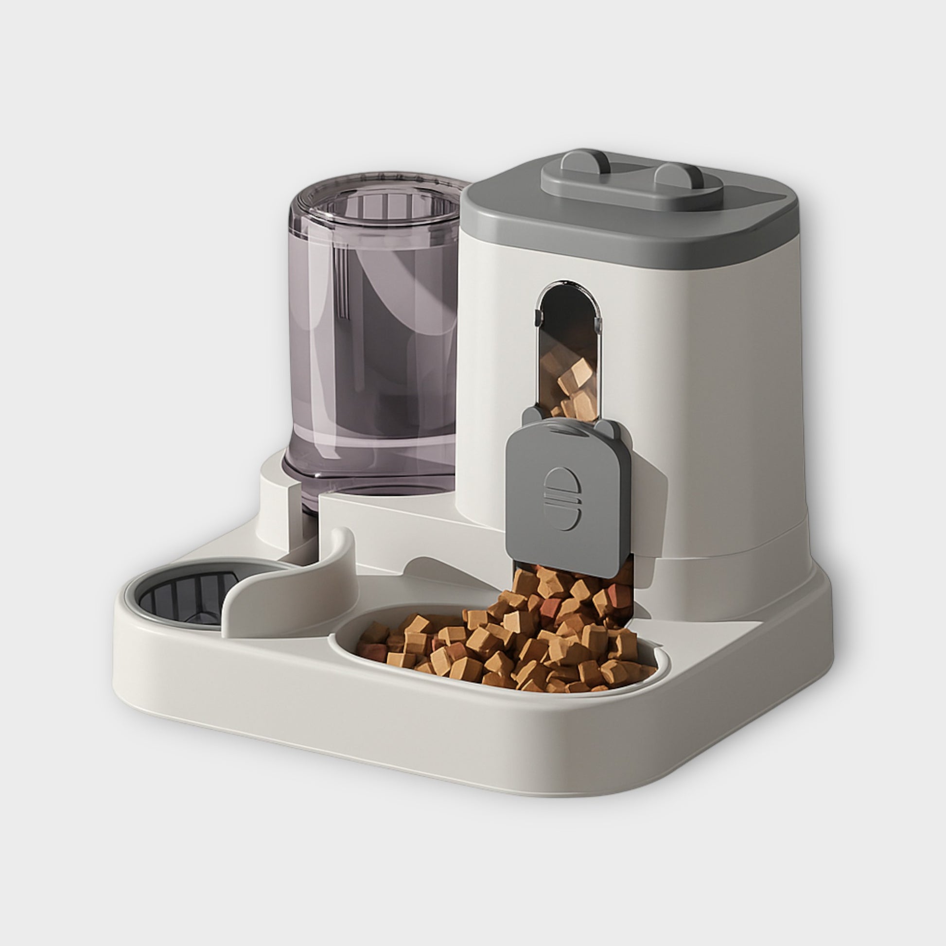 🍽️ Zona de Comida (Lado Izquierdo): Recipiente amplio antisalpicaduras, dispensador automático por gravedad, pienso siempre fresco y disponible, fácil de limpiar.